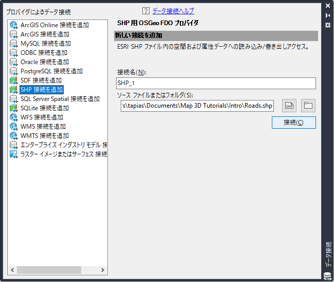 - 左側の[プロバイダによるデータ接続]で[SHP 接続を追加]をクリックします。