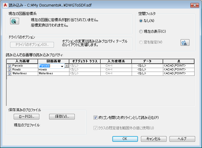 データを読み込むときに、マップ内でデータを構造化できます。データを画層またはオブジェクト クラスに割り当てます。属性データをオブジェクト データ テーブルに追加します。座標系の割り当てその点を点、テキスト、またはブロックのいずれとして読み込むかを指定します。