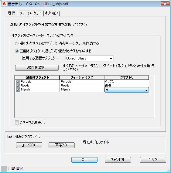 - [書き出し]ダイアログ ボックスの[フィーチャ クラス]タブにある[オブジェクトからフィーチャ クラスへのマッピング]で、適切な[ジオメトリ]エントリを指定します。