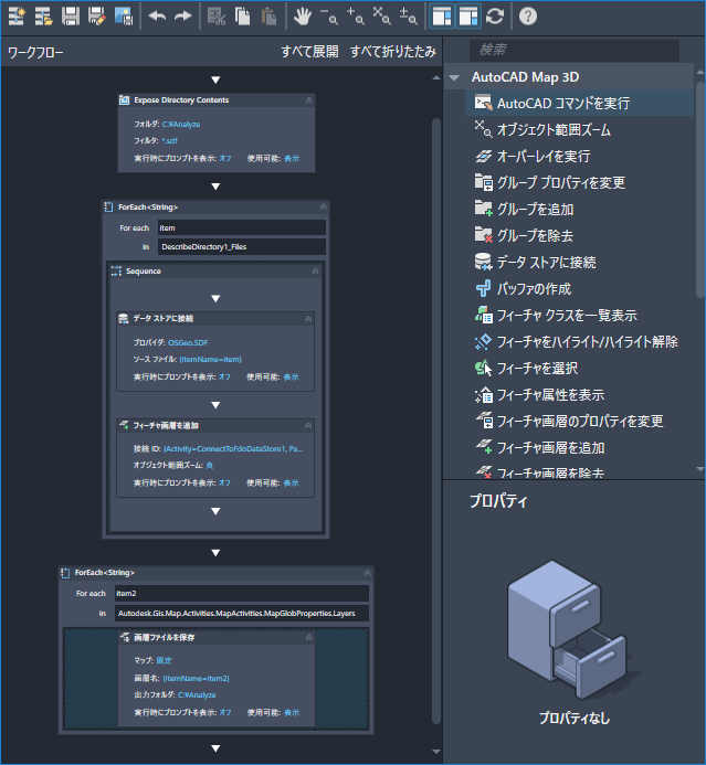 この場合、ForEach アクティビティの名前は "LoopAddLayers"となり、アクティビティの実行内容を示す名前になります。このアクティビティは、[フォルダの内容を検索]アクティビティで指定されたフォルダ内の各 SDF ファイルを調べます。アクティビティは反復実行されるごとに、SDF ファイルに接続して、フィーチャ画層を [表示マネージャ]に追加します。