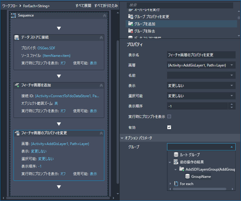 追加する画層ごとに[グループ]プロパティを変更するため、このアクティビティは、[LoopAddLayers]という名前の[ForEach]アクティビティの内部に配置します。
