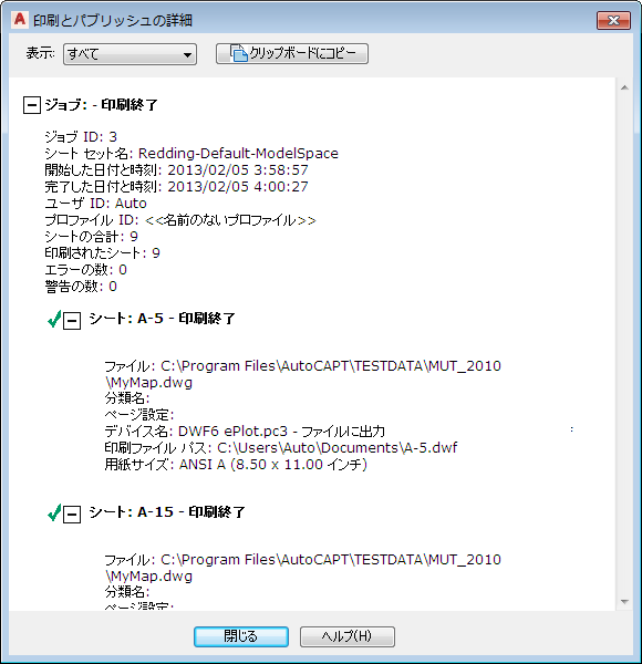 ジョブが完了すると、エラーの有無を通知するメッセージが表示されます。