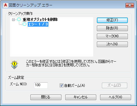 図面クリーンアップが図面内のエラーを探し、[図面クリーンアップ エラー]ダイアログ ボックスを表示します。 このダイアログ ボックスは、エラーをエラー タイプで分類します。[重複オブジェクトを削除]がハイライト表示されています。