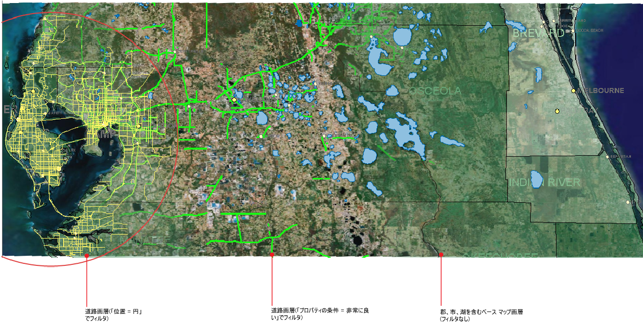 プロパティ フィルタと位置フィルタを使用して、円形の領域内にある道路の条件を表示します。