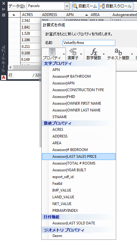 ここまでの演習で、所有者データを Parcels 画層に結合して、結果を新しいデータ ストアに保存しました。組み合わされた情報を使用して、計算したプロパティを作成することができます。計算したプロパティは式の結果になります。この場合は、最新の販売価格を面積で除算した値になります。