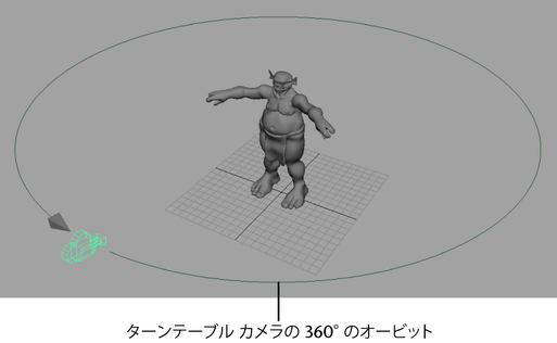 - オブジェクトがアニメートされている場合、ターンテーブル カメラは、アニメーションの最初のフレームでその位置の周囲を回転します。