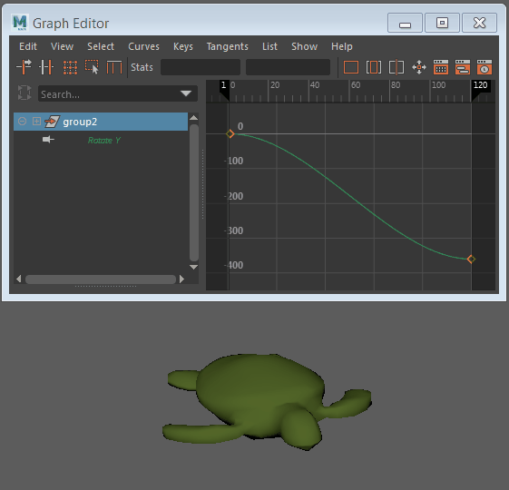 アウトライナ(Outliner)でターンテーブル カメラを含むグループを選択します。グラフ エディタ(Graph Editor)で、アニメーション カーブは、「回転 Y (Rotate Y)」として示されます。