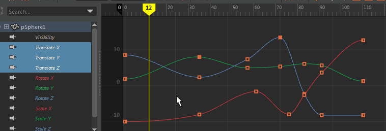 グラフ エディタ(Graph Editor)のカーブ ビューに、選択したチャネルのカーブが表示されます。
