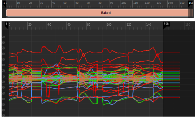 次の画像では、これらのクリップが一緒にベイク処理されています。クリップがオーバーラップしているキーがどのように結合されているか注目してください。このプロセスでは、クロスフェード領域内のアニメーション カーブのみがベイク処理されます。必要な場合のみ、クロスフェード領域外のキーが追加されます。