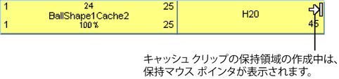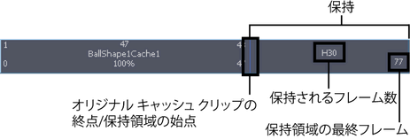 保持領域とは、キャッシュ クリップの一部または延長部分のうち、指定した期間最後の変形が保持される場所のことです。保持領域は、文字 H の付いた文字列として、クリップのほかの部分よりも明るい青で表示されます。
