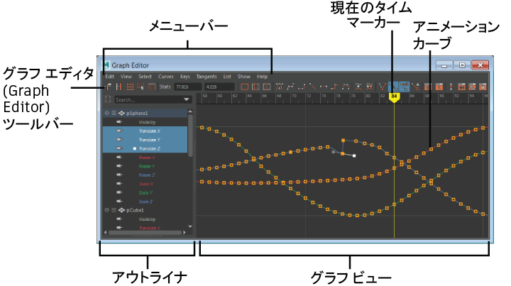 グラフ エディタ(Graph Editor)のメニュー バーには、グラフ エディタ(Graph Editor)のグラフ ビュー内でアニメーション カーブとキーを操作するためのツールと機能が用意されています。