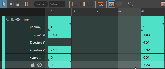 たとえば、時間とキーの領域をカットすると、アニメーション内の残りの時間とキーがずらされ、カットによって生じたギャップが埋められます。その後、時間とキーをペーストすると、アニメーションはシフトされ、ペーストされた時間とキーのためのスペースが作られます。