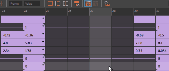 フレーム(Frame)フィールドと値(Value)フィールドは、特定のキーの時間と値を表します。正確な値を入力するか、チャネル ボックス(Channel Box)の次の演算子を使用します。