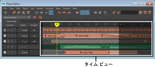 タイム(Time)ビューにクリップを追加する方法については、「タイム エディタ クリップを操作する」を参照してください。