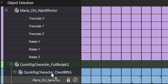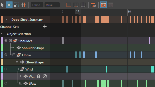 ドープシート(Dope Sheet)を使用してキーの時間を操作し、ビュー領域にカラー付きの長方形として表します。これらの長方形は、水平軸に沿って時間単位を表します。縦軸は、ドープ シート(Dope Sheet)のアウトライナに読み込まれている項目を表します。