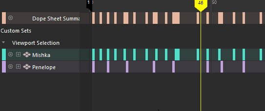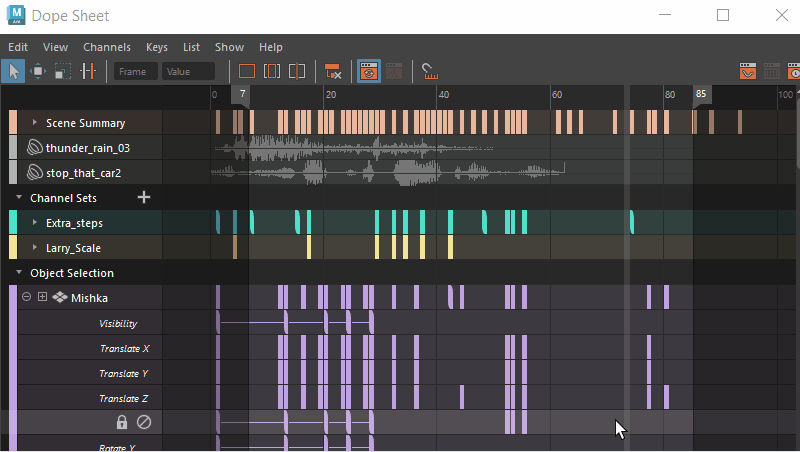 ドープシート(Dope Sheet)エディタを使用すると、高密度のキーフレームを簡単に操作でき、大規模なタイミング編集を行うことができます。