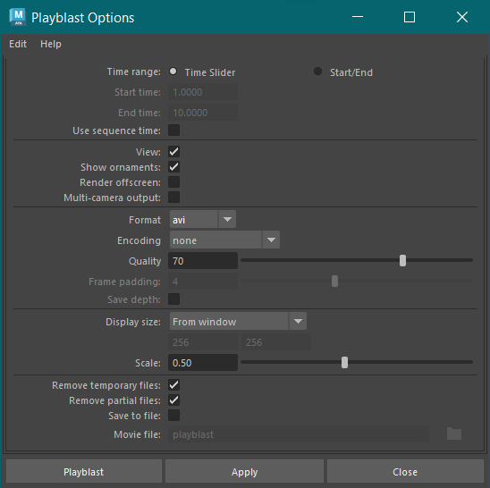 タイム スライダに示されているタイム レンジ全体をプレイブラストするか、またはプレイブラストの開始フレームと終了フレームを独自に設定するかを選択できます。