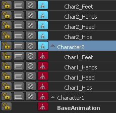 これで、2 つのレイヤ階層がセットアップされたので、両方のキャラクタのヒップを選択し、これらに同時にキーフレーム設定することができます。各キャラクタのキーフレームが、個々のレイヤに自動的に設定されます(「アニメーション レイヤのオブジェクトにキーフレームを設定する」も参照してください)。