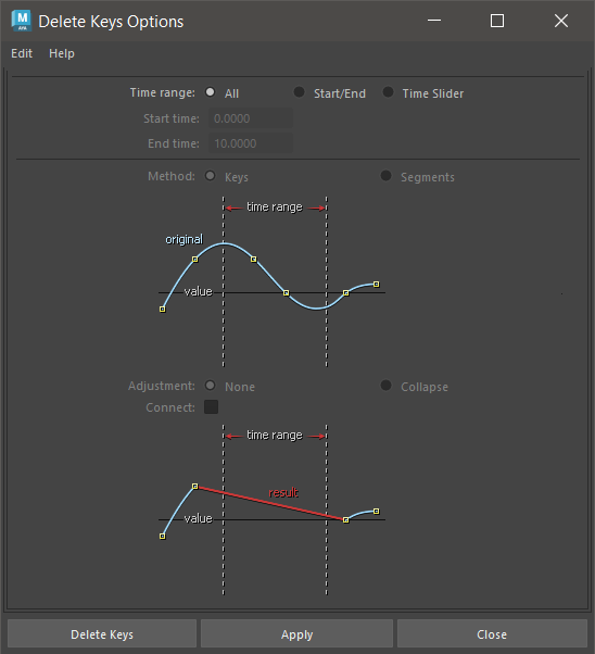 指定された範囲内にあるキーを除去します。削除された領域の両端に隣接してキーが残っている場合、作成するアニメーション カーブは、カット領域のキーのアウト接線とイン接線を維持します。