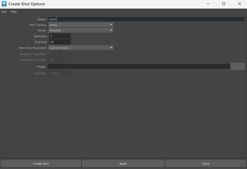 ショットの作成オプション(Create Shot Options)を使用すると、特定の開始フレームと終了フレーム、または特定の継続期間を指定してショットを作成できます。