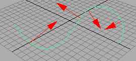カーブのシェイプが凸状または凹状に切り替わると、カーブの法線は一気に 180 度シフトすることに注意してください。このため、パス アニメーションでワールド空間内のカーブを使用する際に、アップ方向(Up Direction)オプションで法線(Normal)を選択すると、望ましくない結果が生じる場合があります。