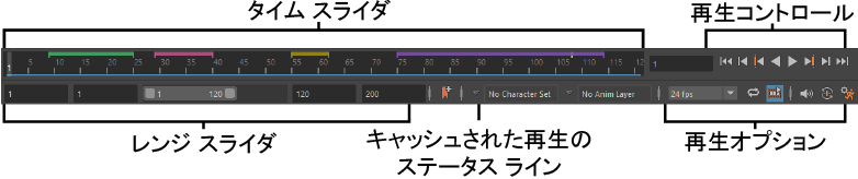 タイム スライダ(Time Slider)は、再生レンジ、キー、再生レンジ内のブレイクダウンを制御します。 タイム スライダ(Time Slider)の下部にある青いストライプはキャッシュされた再生(Cached Playback)ステータス ライン、、上部にある色付きのストライプはタイム スライダ(Time Slider)のブックマークです。