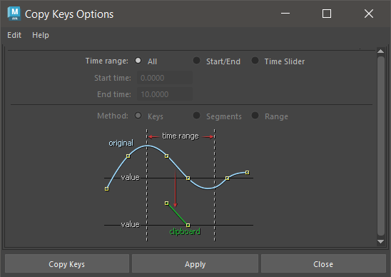 再生開始(Playback Start)と終了(End)の範囲内(タイム スライダ(Time Slider)のレンジ スライダの開始(Start)および終了(End)時間の間)のすべてのキーをカットまたはコピーします。