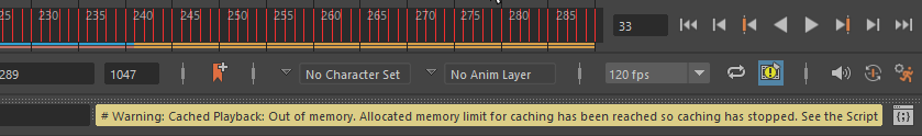 - キャッシュされた再生(Cached Playback)の実行時にサポートされないノードが見つかったために、アニメーションをメモリに送信できない場合は、この警告状態がトリガされます。キャッシングの停止原因に関するメッセージがスクリプト エディタ(Script Editor)に出力されます。