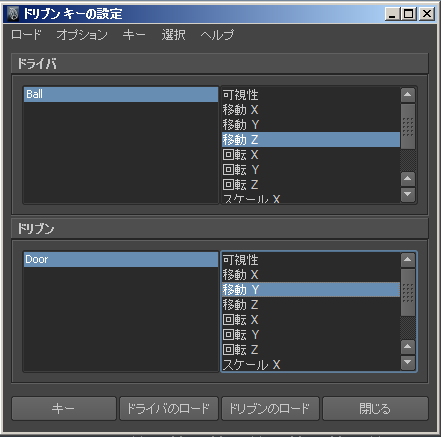 これにより、ボールの移動 Z (Translate Z)の現在値を、ドアの移動 Y (Translate Y)の値とリンクするドリブン キーが設定されます。