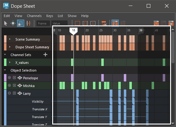 ドープシート(Dope Sheet)のアウトライナには、階層内で選択したオブジェクトのアトリビュートが表示され、タイプとオブジェクトに応じてアトリビュートをグループに整理することができます。アウトライナの使用の詳細については、「ドープシート(Dope Sheet)のアウトライナ」を参照してください。