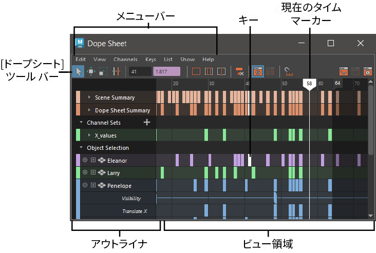 エディタの左側のアウトライナには、アニメーション キーを表すドープシート(Dope Sheet)ノードが配置されています。これは Maya のアウトライナ(Outliner)に似ていますが、ドープシート(Dope Sheet)固有の機能が含まれています。