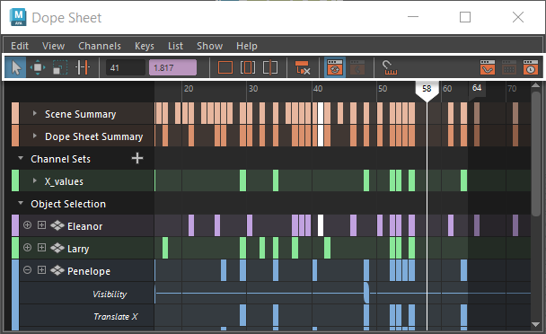 ドープシート(Dope Sheet)のツールバーには、よく使用されるドープシート(Dope Sheet)操作にすばやくアクセスするためのアイコンがあります。各アイコンの機能の説明については、「ドープシート(Dope Sheet)のツールバー」を参照してください。