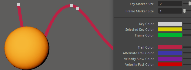 - モーション軌跡(Motion Trail)を選択し、モーション軌跡エディタ(Motion Trail Editor)の表示オプション(Display Options)セクションにあるキーフレームの表示(Show Keyframes)をオンにします。