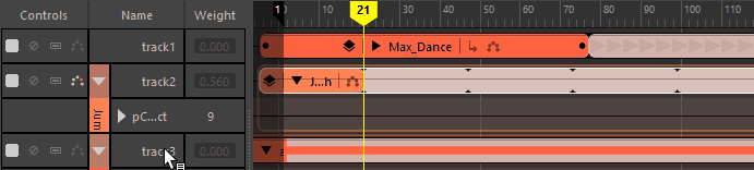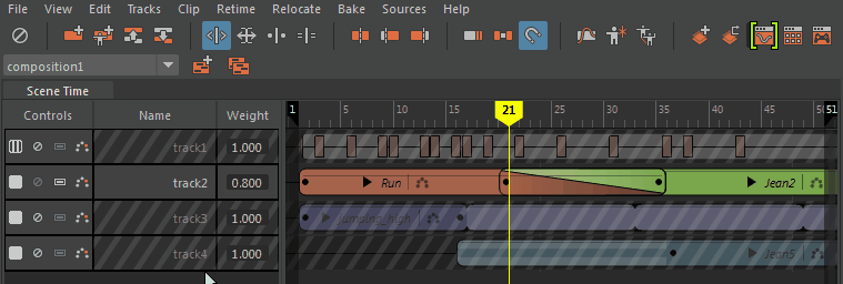 - クリップのウェイトを調整することで、生成されるアニメーション内の他のクリップと比較しながら、影響の度合いを制御できます。ミックス ウェイトの値が大きいほど、クリップがアニメーションに強く影響します。グループ クリップのミキシングは、さらに高いレベルでアニメーションを簡単にブレンドできる方法です。クリップのウェイトの詳細については、「タイム エディタ クリップのウェイトにキー設定する」を参照してください。