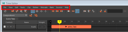 - タイム エディタ(Time Editor)にアニメーションを読み込む手順については、「タイム エディタ(Time Editor)にアニメーションを読み込む」を参照してください。