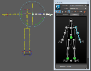 タイム エディタ(Time Editor)で HumanIK キャラクタ リグを使用するには、特別に考慮する点がいくつかあります。HumanIK リグには、さまざまな組み合わせの HumanIK コントローラをコントロールするフル ボディ(Full Body)やボディ パーツ(Body Part)など、特別なキー設定モードがあるからです。このような HumanIK 固有モードがあるため、適切なコントローラが選択されていることも確認する必要があります。