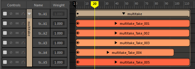 - 各テイクは 1 つのクリップに変換し、アニメーション トラックに沿って並びます。