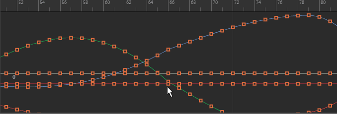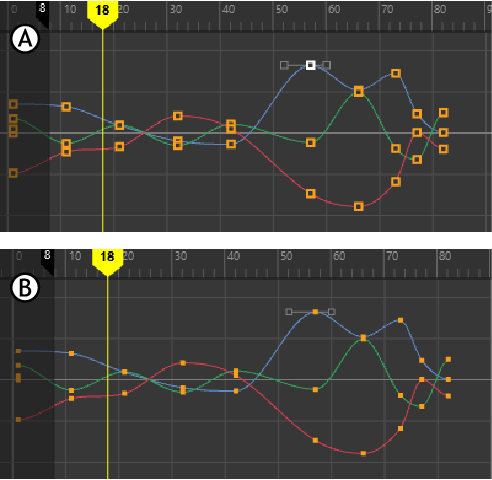 注: カーブ セグメントについて接線の統一(Unify Tangents)が選択されている場合は、選択したハンドルを編集するときに、キーの両側のハンドルが均等に調整されます。接線の分割(Break Tangent)オプションが選択されている場合は、個々の接線ハンドルが相互に独立して動作します。