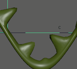 - デフォメーションは、影響を受ける頂点の中心から放射状に広がります。スパイクの付いたドラゴンの尾の場合、アタッチメント モードをフル(Full)に設定すると、デフォーマのソリッド化がスパイクの中心から開始するようになり、不適切な外観になります。ドラゴンの尾の例では、境界(Borders)を使用することをお勧めします。変形している衣服に付いているボタンなどの場合は、フル(Full)を選択すると適切に機能します。