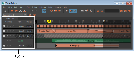 ここには、キーの表示(Show keys)、ミュート(Mute)、ソロ(Solo)、ゴースト(Ghost)、ウェイト(Weight)などのリスト項目コントロールが配置されています。これらのコントロールおよびその他の操作については、「タイム エディタ(Time Editor)トラックを操作する」を参照してください。
