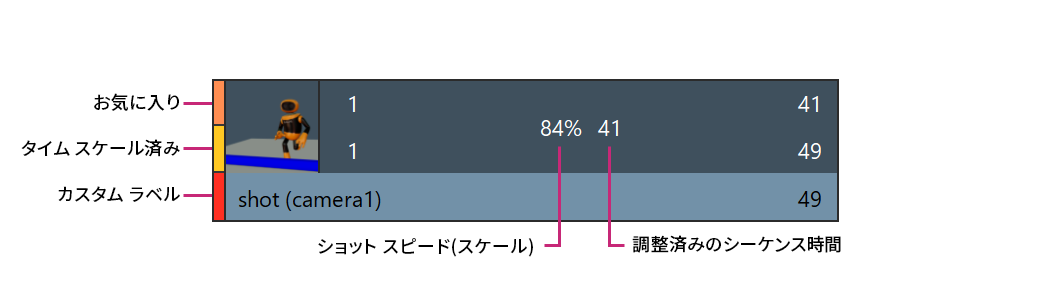 シーケンサ タイムラインでショットが選択した色で表示されるよう更新されます。