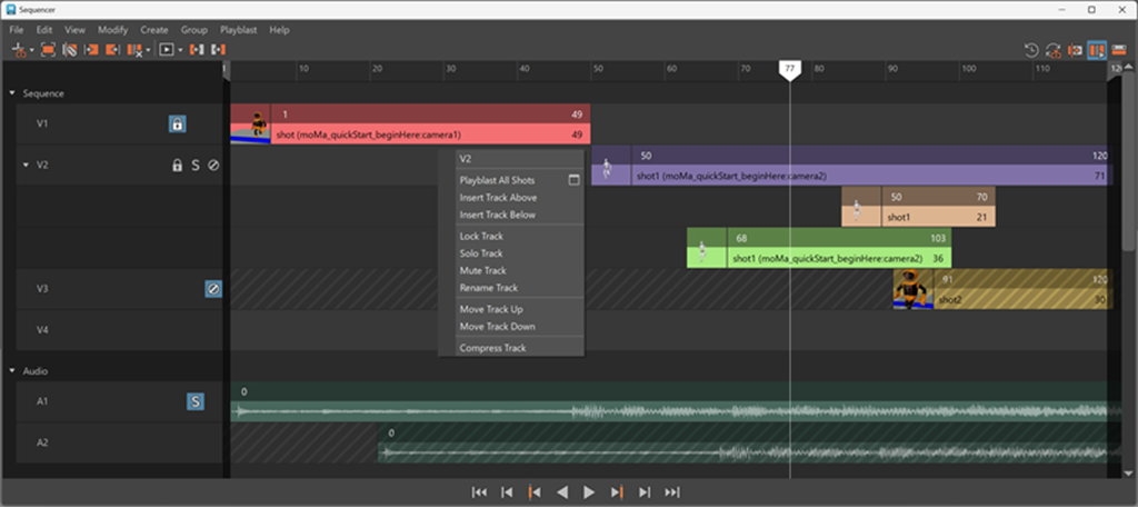 各ショットは、特定のフレーム レンジにおける 1 つのカメラを表します。ショットはトラック上に配置され、必要に応じてショットをスタックしたりオーバーラップしたりできます。