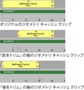 ジオメトリ キャッシュ クリップをトリムして、キャッシュ クリップの最初または最後から変形のセグメントを取り除くことができます。これによりキャッシュ クリップのソースの開始点(Source Start)とソースの終点(Source End)の時間が変更されます。キャッシュ クリップをトリムしても、ディスク上の接続されたキャッシュ ファイルには作用しません。トリム(Trim)を使用してキャッシュ クリップから取り除いた断片は削除はされず、キャッシュ クリップの長さを元に戻すと回復します。