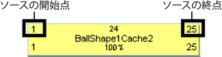 キャッシュ クリップのソースの開始点値を変更すると、フレームがキャッシュ クリップの最初からトリムされます。キャッシュ クリップのソースの終点(Source End)値を変更すると、キャッシュ クリップの終端のフレームをトリムします。ソースの開始点(Source Start) / ソースの終点(Source End)を参照してください。トリムしたフレームは、ディスク上のクリップまたは接続されているファイルからは削除されません。キャッシュ クリップの長さを元に戻すと回復します。