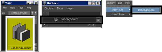 ソース クリップは、バイザー(Visor)、アウトライナ(Outliner)、または Trax のライブラリ(Library)メニューからアクセスできます。「バイザー(Visor)、アウトライナ(Outliner)、およびクリップ ライブラリ(Clip Library)について」を参照してください。ソース クリップを編集するには、チャネル ボックス(Channel Box)でそのアトリビュートを変更します。「ソース クリップを編集する」を参照してください。