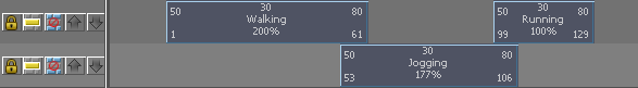 トラックを使用して、キャラクタのアニメーション シーケンスを位置合わせ、分割、またはグループ化できます。また、トラック コントロール領域のボタン(ロック、ミュート、およびソロ)を使用して、トラックの状態を制御することもできます。トラックを作成または除去するときには、コンテキスト依存メニューを使用するか、クリップをトラック ビュー領域で上下方向にドラッグします。トラックをキャラクタ、グループ、サブキャラクタに追加する方法については、「トラックを選択/追加/除去する」を参照してください。
