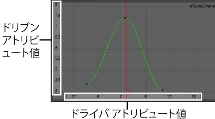 グラフ エディタのカーブでは、個々のドライバ アトリビュート値に対応するドリブン アトリビュート値が表示されます。このカーブを編集すると、各アトリビュート間のリレーションシップを変更することができます。