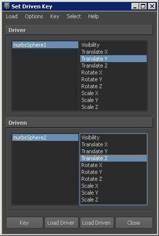 ヒント: オブジェクトを既存のドライバ(Driver)またはドリブン(Driven)のリストに追加するには、ドライバのロード(Load Driver)またはドリブンのロード(Load Driven)をクリックする前にドリブン キーの設定(Set Driven Key)ウィンドウでオプション > ロード時にクリア(Options > Clear On Load)をオフにします。