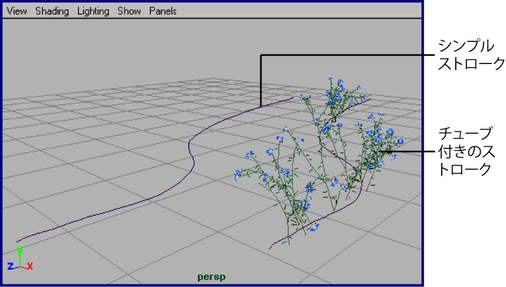 シーン ビュー内でペイントを行うときシンプル ストロークはカーブとして表示されます。チューブ付きのストロークはワイヤフレームとして表示され、レンダー結果を擬似的に表現します。ポスト プロセス レンダーを行うまでペイントはストロークに適用されないため、シーン ビュー内でのペイントは非常に高速です。また、単に高速なだけでなく、作業のガイドラインとして用いるのにも十分な信頼性があります。再描画のスピードを改善する場合は、(ワイヤフレームとして表示されるオブジェクトの表示精度を調整するときと同様に)ワイヤフレーム ストロークの表示精度を調整することができます。