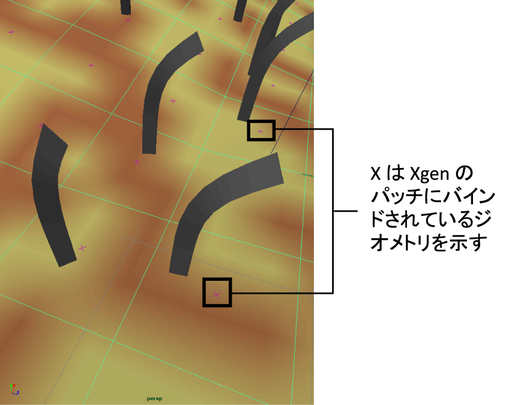 アイコンで示されます。シーン ビューでは、XGen パッチにバインドされた領域ではジオメトリ フェースの中央にマゼンタ色の X が表示されます。パッチには、修正するアトリビュートがありません。パッチにバインドするポリゴン フェースを変更するには、フェースのバインド(Bind Face)メニュー オプションを使用します。